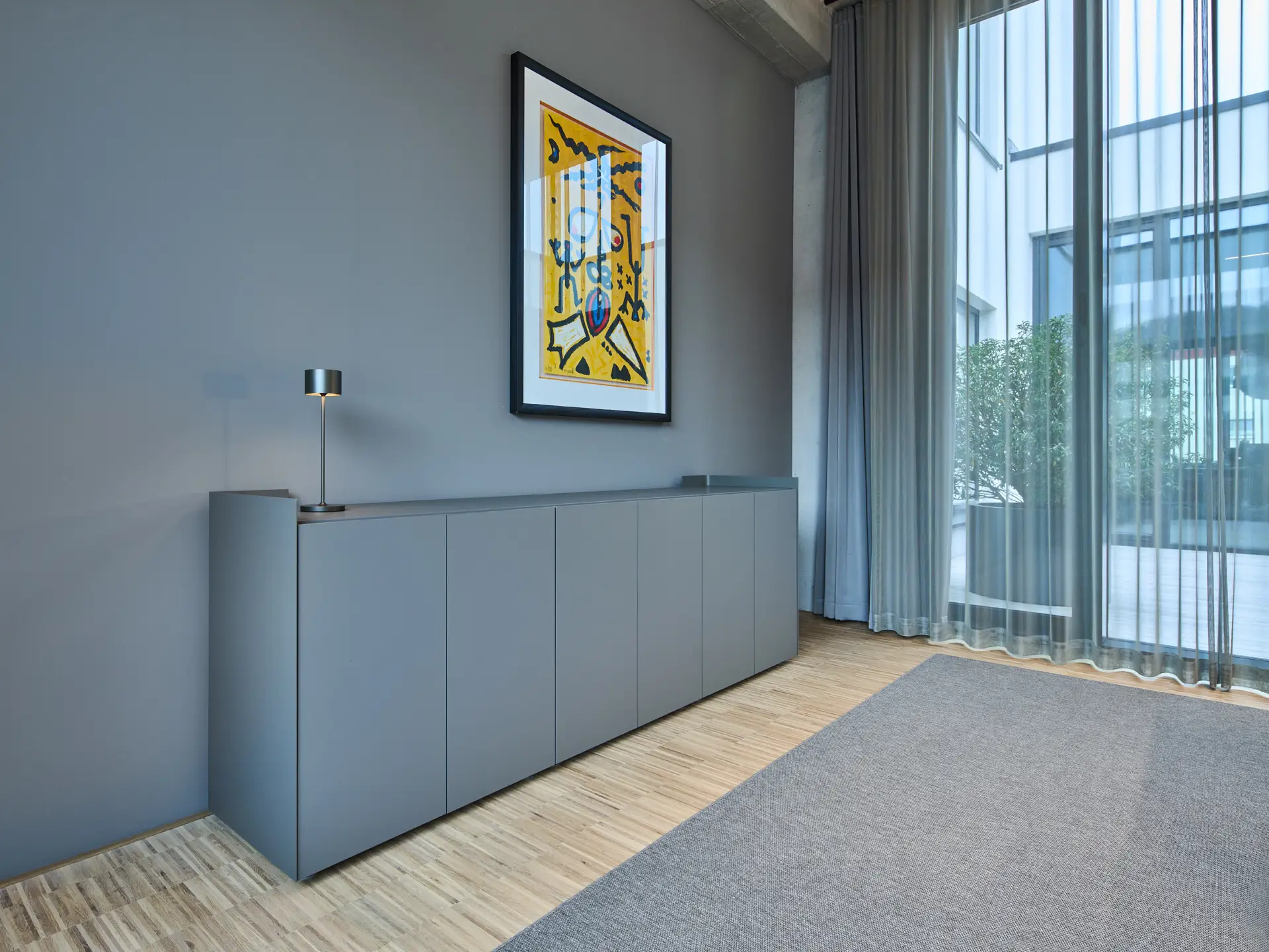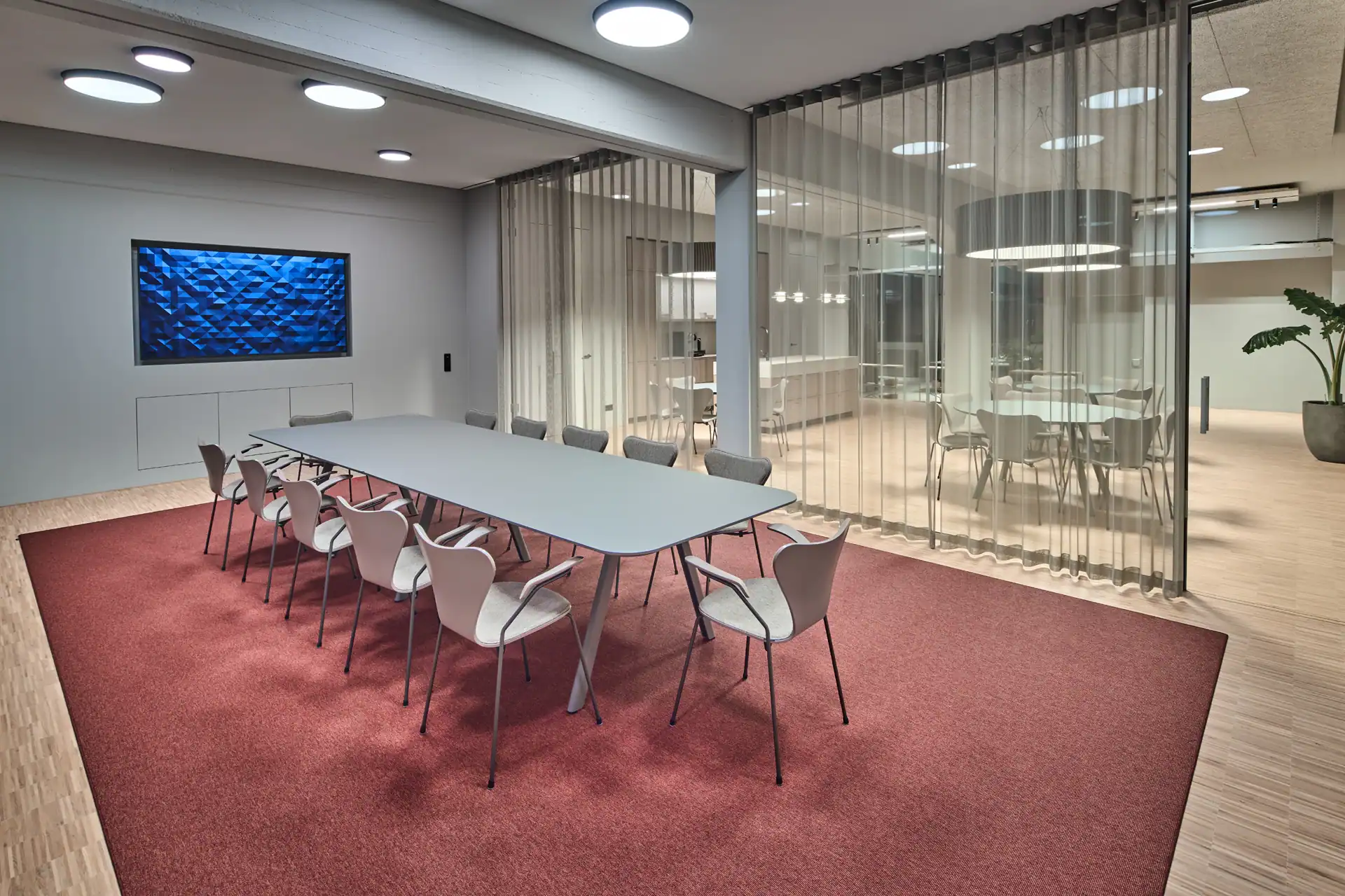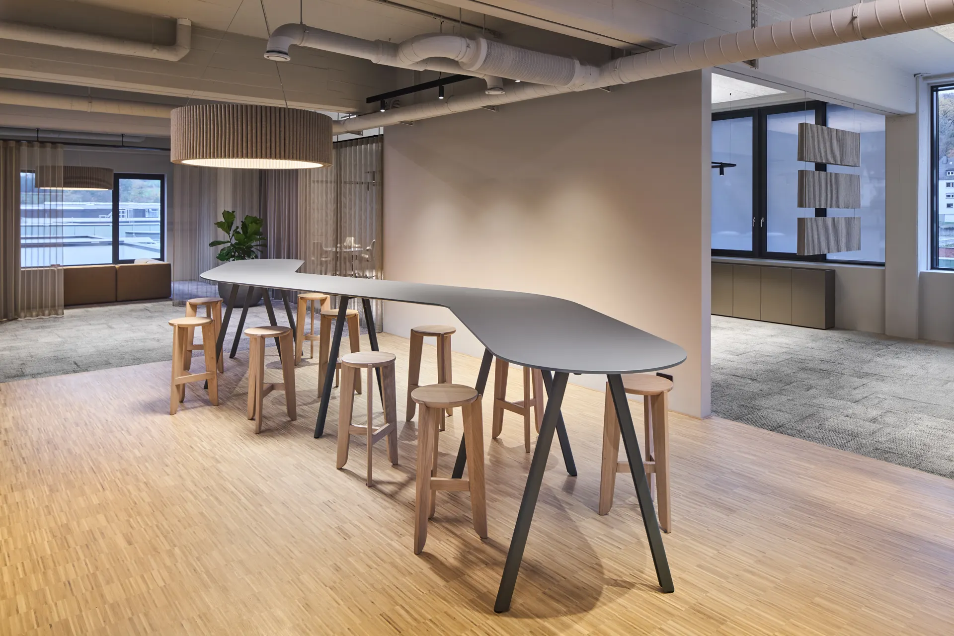 SLIDE und SLIDE Connect Tische fungieren als verbindendes Gestaltungselement im gesamten Gebäude. Zum Einsatz kommen flexible Konferenztische, Steh- und Besprechungstische ebenso wie höhenverstellbare Schreibtische, ergänzt durch passende Container und Sideboards. Das modulare und vielseitige Tischsystem zoniert Großraumbüros, definiert Arbeits-, Besprechungs- und Rückzugsbereiche und unterstützt unterschiedliche Nutzungsszenarien. Fotos: Christoph Meinschäfer